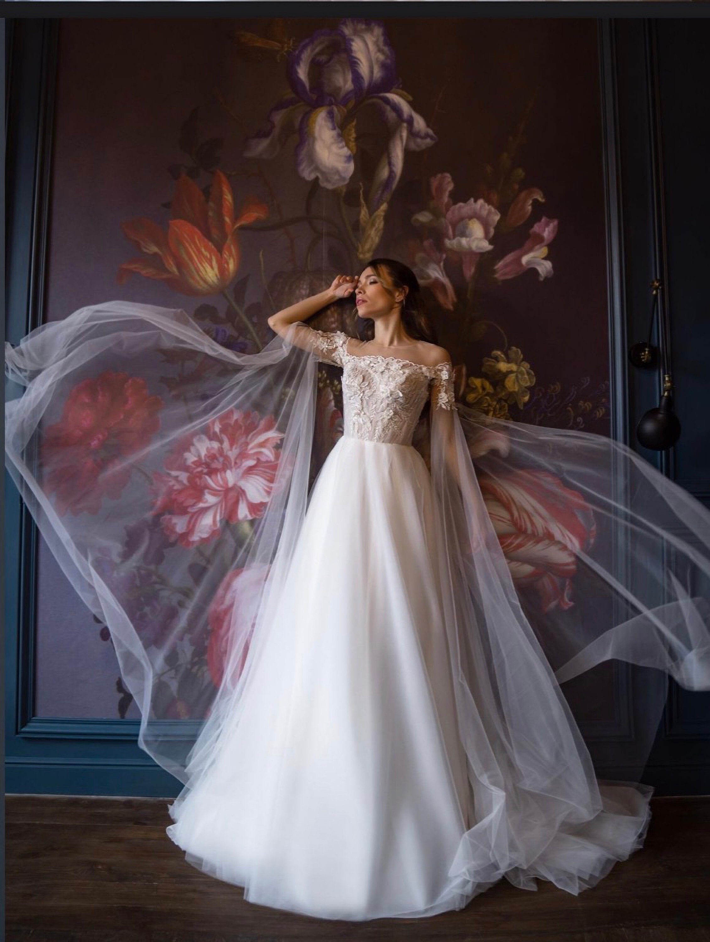 flowy off shoulder wedding dress